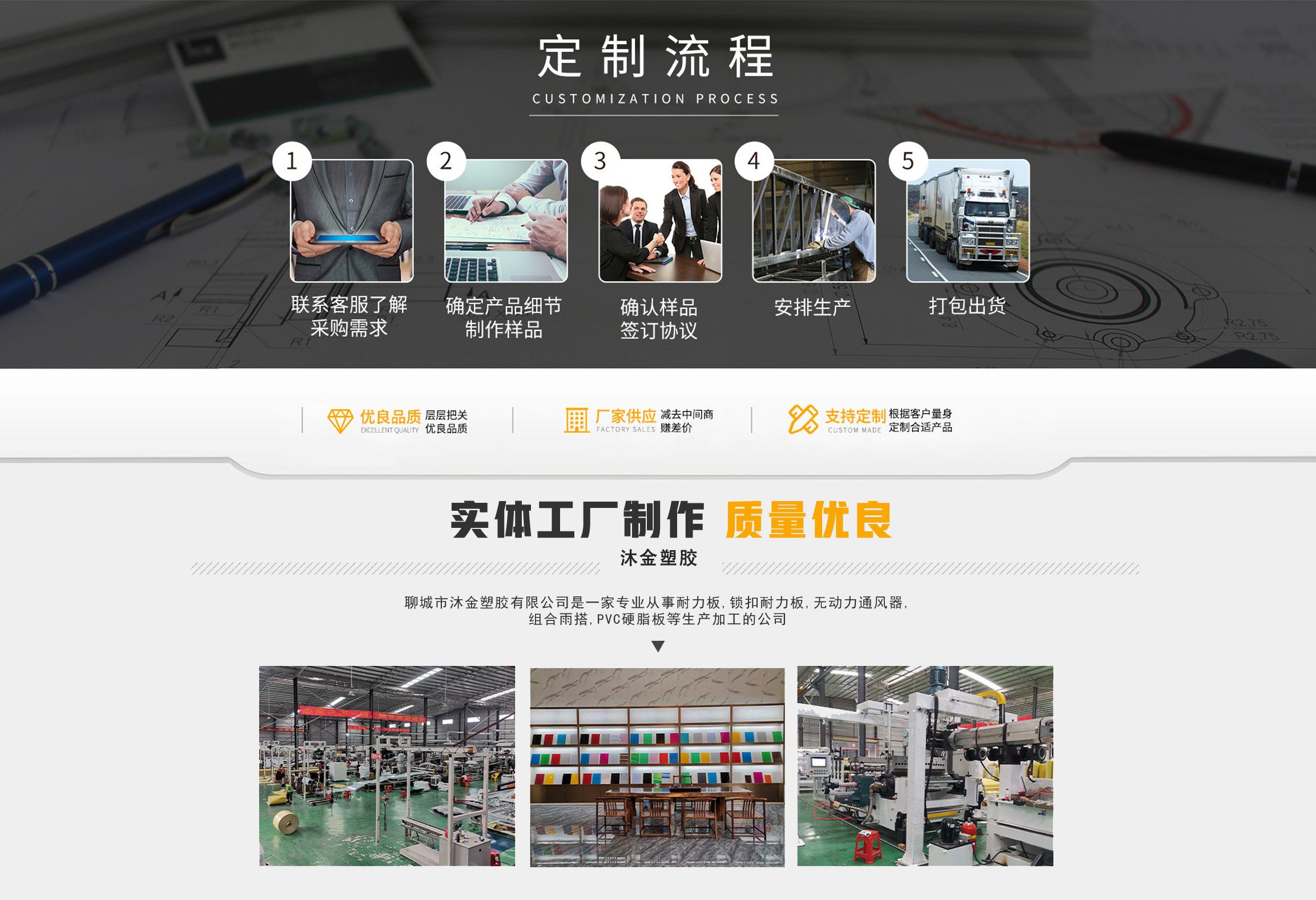 聊城市沐金塑膠有限公司注冊(cè)資金2180萬元,占地20000余平方,擁有自建廠房15000平方,員工100余名。10余年來,公司主營(yíng)耐力板,鎖扣耐力板,耐力板深加工,無動(dòng)力通風(fēng)器,組合雨搭,PVC硬脂板,耐力板廠家等板材的發(fā)展戰(zhàn)略,逐漸成長(zhǎng)為綜合性企業(yè)。 公司擁有多條板材共擠生產(chǎn)線,采用世界知名品牌進(jìn)口原材料和先進(jìn)工藝,依據(jù)完善的ISO9001質(zhì)量管理體系和ISO14001環(huán)境管理體系,為產(chǎn)品的卓越品質(zhì)提供了強(qiáng)有力的保證。憑借過硬的創(chuàng)新能力和堅(jiān)實(shí)的硬件基礎(chǔ),贏創(chuàng)已成為國內(nèi)領(lǐng)先的熱塑性板材生產(chǎn)商,產(chǎn)品被廣泛應(yīng)用于建筑業(yè)、農(nóng)業(yè)、工業(yè)、廣告業(yè)、安防行業(yè)及DIY領(lǐng)域。 公司始終致力于通過提供最優(yōu)的板材應(yīng)用解決方案,為客戶創(chuàng)造最高的價(jià)值;堅(jiān)守創(chuàng)新、質(zhì)量、靈活、服務(wù)和速度的核心價(jià)值觀;堅(jiān)持“完美的產(chǎn)品需要完美服務(wù)的支持”的經(jīng)營(yíng)理念,努力實(shí)現(xiàn)成為世界領(lǐng)先的板材與解決方案供應(yīng)商的夢(mèng)想。 在未來,公司將立足客戶需求,不斷改變和完善現(xiàn)有產(chǎn)品,拓展產(chǎn)品線和充分開發(fā)板材的應(yīng)用領(lǐng)域,為客戶創(chuàng)造全方位的價(jià)值。同時(shí)更好地實(shí)現(xiàn)員工的價(jià)值,實(shí)現(xiàn)公司團(tuán)隊(duì)的價(jià)值。我們將與您一起創(chuàng)贏未來! 企業(yè)使命:成為世界領(lǐng)先的板材與解決方案供應(yīng)商。 公司愿景:通過提供最優(yōu)的板材應(yīng)用解決方案,為客戶創(chuàng)造最高的價(jià)值。 核心價(jià)值觀:質(zhì)量...